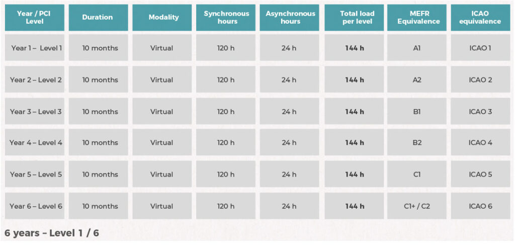 The English Competency Program (PCI) is developed progressively across 6 levels, supporting the student’s advancement from beginner to advanced level, combining synchronous and asynchronous learning activities.